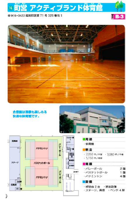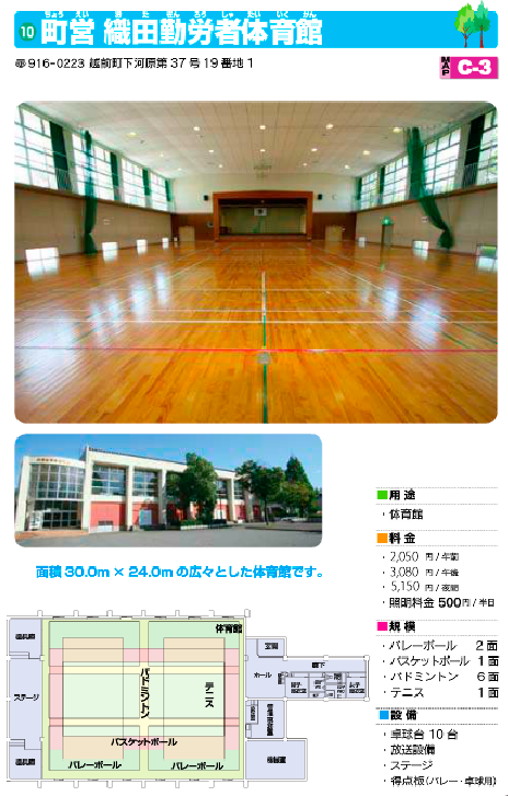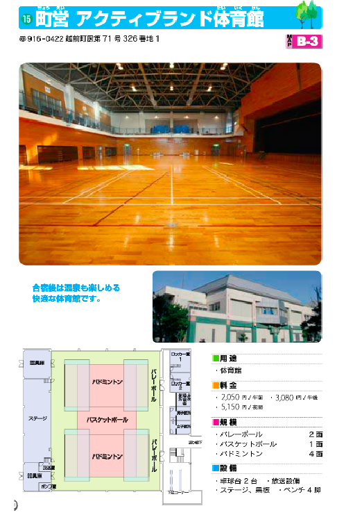 越前町内の体育館、グラウンド、テニスコートなどの情報パンフレットです。自治体等所有に付き、料金や営業情報は予告なく変更になる場合があります。