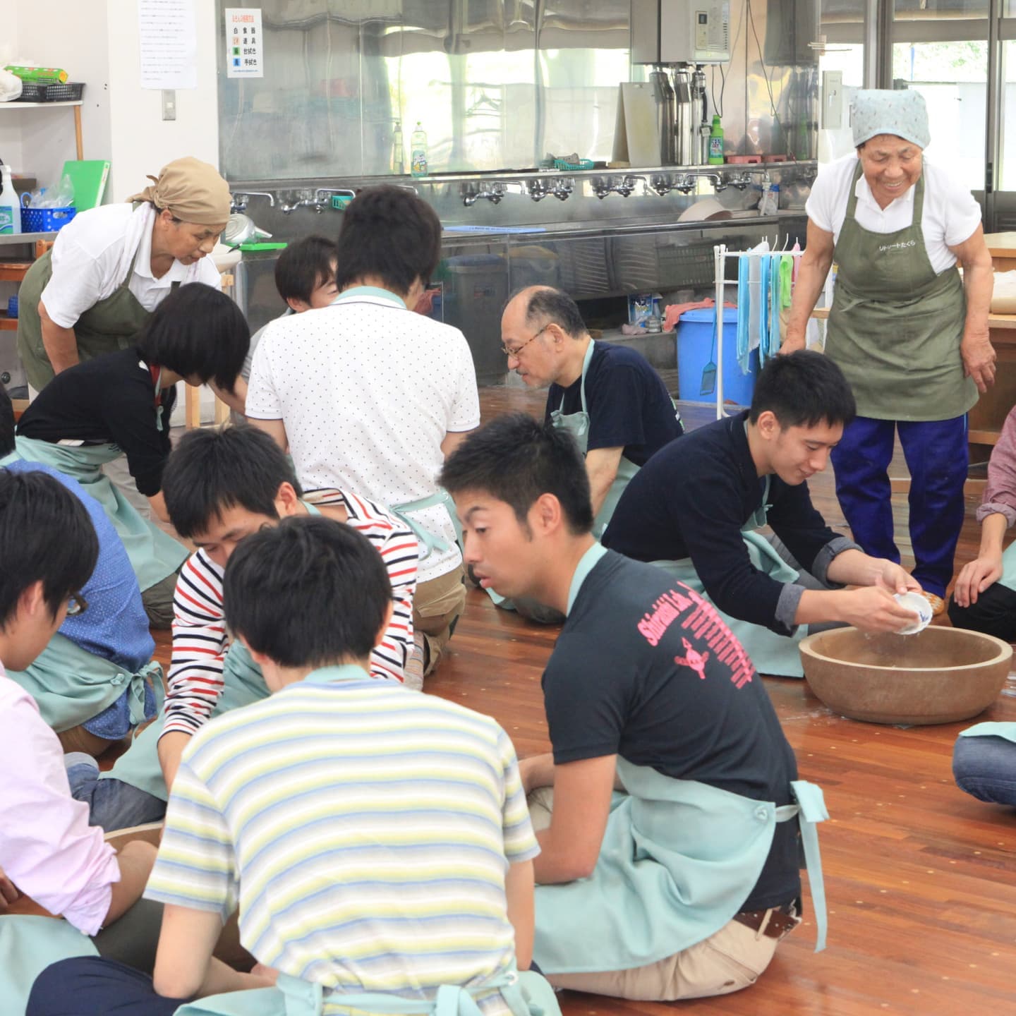 そば打ちの後はワイワイと各自の腕前を批評しながら、出来栄えを下でチェック!。遊んでお腹も満たせて一石二鳥です。人気の施設ですので早めのご予約をお願い致します。