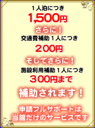 1人泊あたり2,000円の補助金を交付。越前町指定の観光施設、体験施設利用で1人300円まで補助されます。(令和6年度現在・補助額、要項は予告なく変更となる場合がございます)例えば、10名様が2泊され、露天風呂漁火(510円)を利用した場合。10名✕2泊=20人泊 2,000円✕20人泊=40,000円、施設補助20人✕300円=6,000円 46,000円の補助金が交付されます。福井県内の学生様は、補助の金額が異なります。また、30万円が上限額でございます。